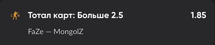 Представим матч между Faze и The Mongolz. На тотал карт больше 2,5 букмекер дает коэффициент 1.8, а на тотал меньше – 1.95. Если счет в матче будет 2-1 (при этом неважно, кто победит), то ставка на ТБ окажется победной. В таком случае при ставке в 1000 ₽ можно выиграть 850₽ чистыми.