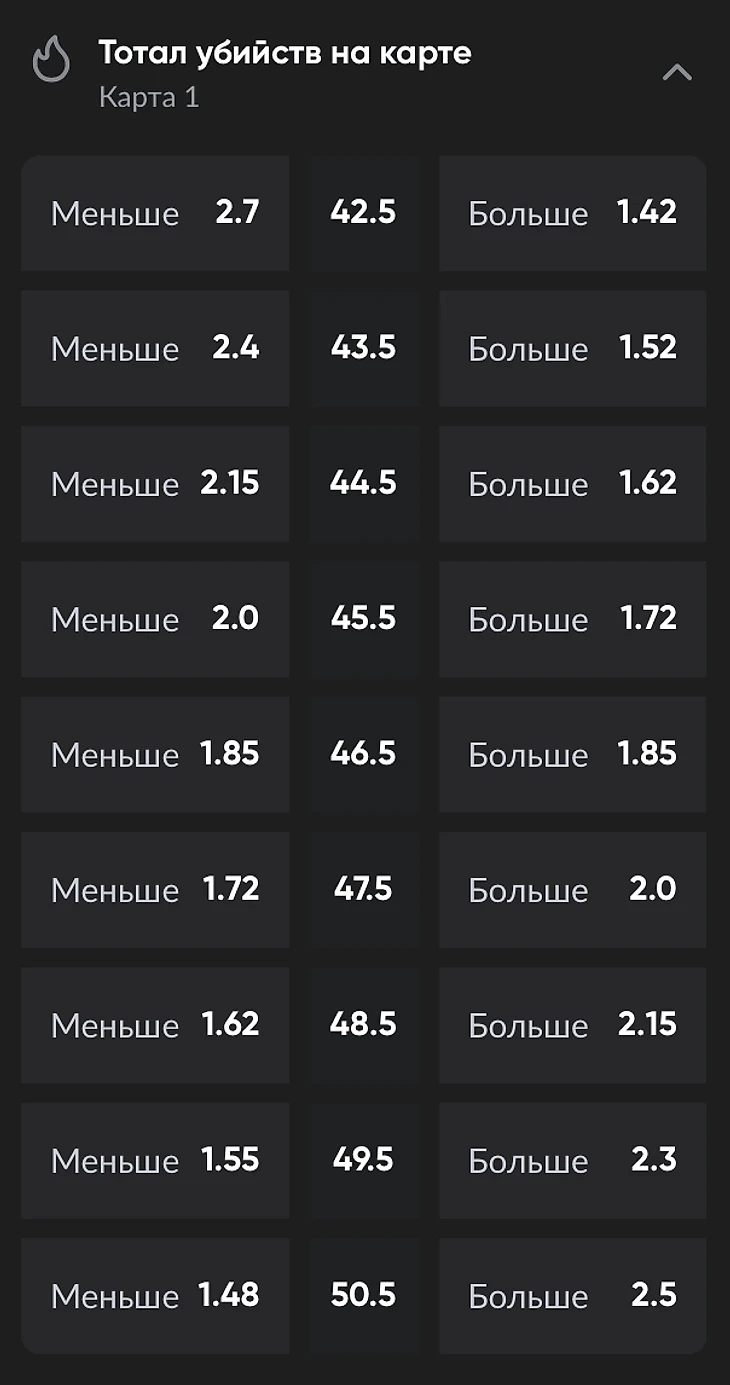 Например, на тотал убийств больше 44,5 дается коэффициент 1.9. Если команды сделают 45 и больше киллов на карте, то ставка выиграет. Если будет всего 44 фрага или меньше, то ставка проиграет.