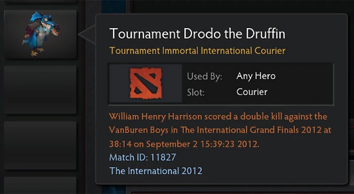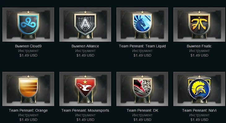 Когда киберспорт в Доте только зарождался, командам требовался дополнительный заработок. Так, во время второго Инта Valve выпустила особые предметы, которые показывали, за какую команду вы болеете.