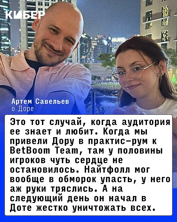 Ты упомянул Дору – я вообще не считаю, что это ошибка. Взаимодействие с Дорой – возможно, одно из лучших и самых успешных взаимодействий. Это тот случай, когда аудитория ее знает и любит. Когда мы привели Дору в практис-рум к BetBoom Team, там у половины игроков чуть сердце не остановилось. Найтфолл мог вообще в обморок упасть, у него аж руки тряслись. А на следующий день он начал в Доте жестко уничтожать всех. Не знаю, насколько это связано, но Дора – это была очень успешная коллаборация. И, наверное, будет больше с ней интересных историй.