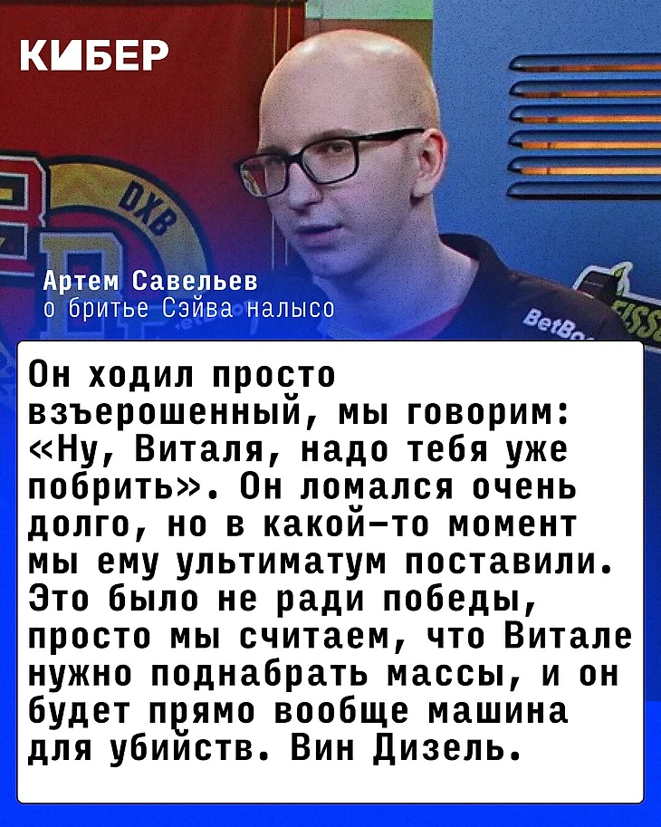 А Сэйва мы брили по простой причине. Он ходил просто взъерошенный, мы говорим: «Ну, Виталя, надо тебя уже побрить». Он ломался очень долго, но в какой-то момент мы ему ультиматум поставили. Это было не ради победы, просто мы считаем, что Витале нужно поднабрать массы, и он будет прямо вообще машина для убийств. Вин Дизель.