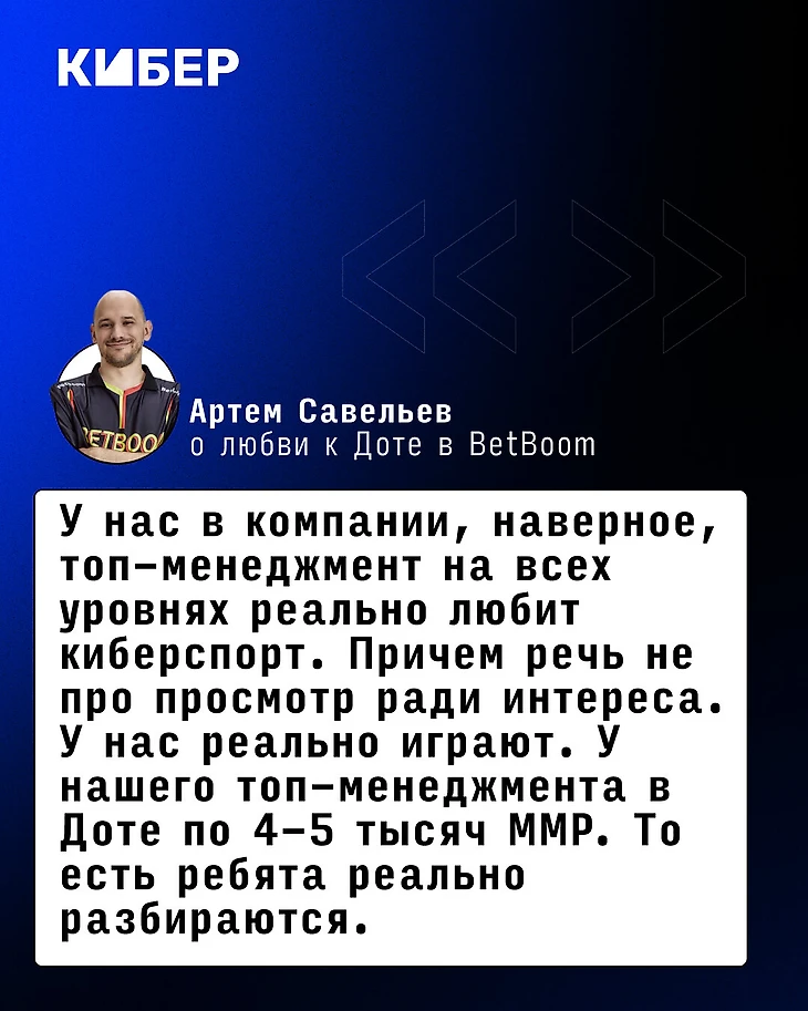 – Максимально близко. У нас в компании, наверное, топ-менеджмент на всех уровнях реально любит киберспорт. Причем речь не про просмотр ради интереса. У нас реально играют. У нашего топ-менеджмента в Доте по 4-5 тысяч ММР. То есть ребята реально разбираются.