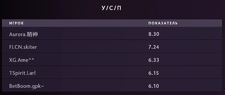 Но особенно засиял Larl. Тиммейтам Дениса местами не хватало стабильности, но он всегда выдавал роскошный уровень даже в проигранных без шансов катках. Статистически Сигитов никогда не выделялся даже среди остальных мидеров, а тут влетел на 4 место по KDA. Выше только Ame, Lorenof и Skiter, которые всегда имеют шикарные цифры: