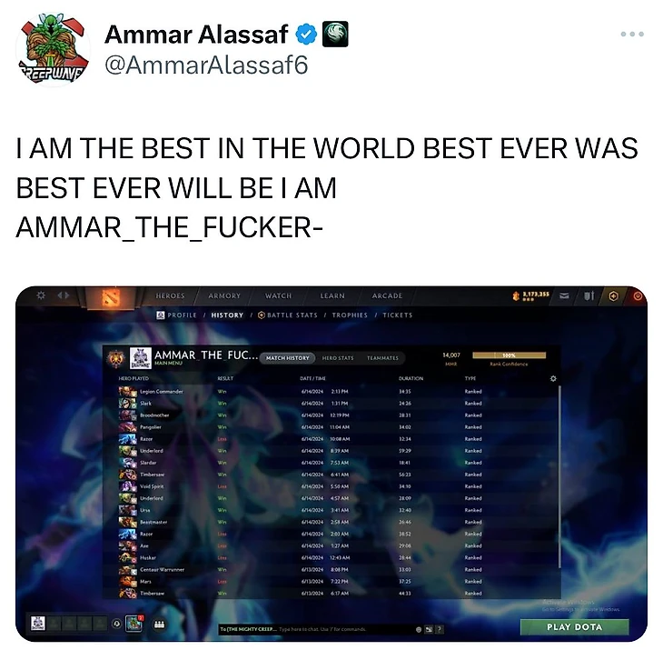 Тем временем Аммар вторым в мире апнул 14К MMR!