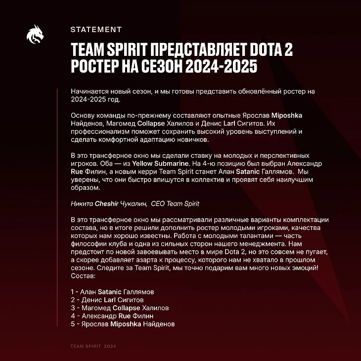 «Мы подтверждаем, что эра состава нашей команды, победившей на множестве мейджоров и занявшего второе место на TI подходит к концу. Все узнаете к выходным».