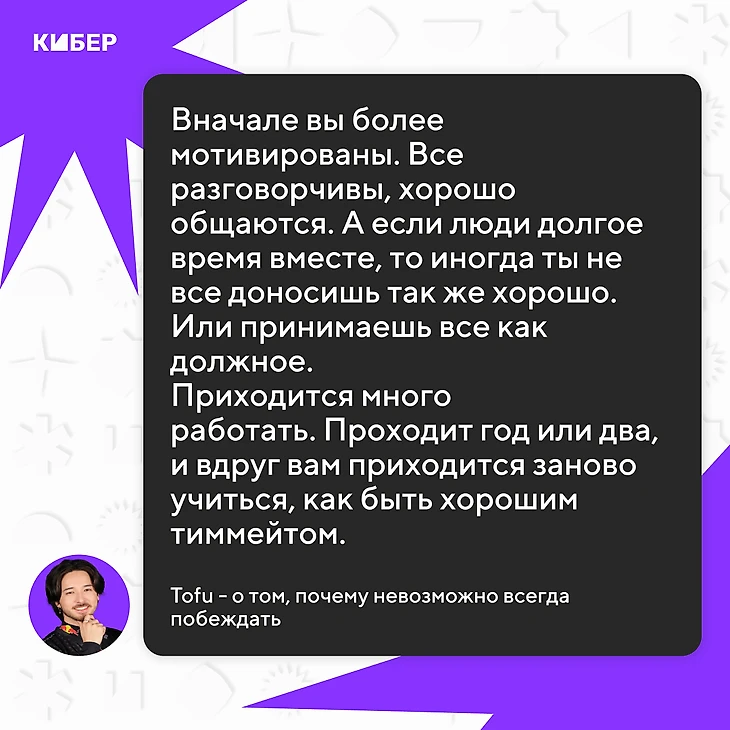 Допустим, проходит год или два, и вдруг вам приходится заново учиться тому, как быть хорошим тиммейтом. Как взаимодействовать с людьми, чтобы держаться на высоком уровне. Легко стать самодовольным.