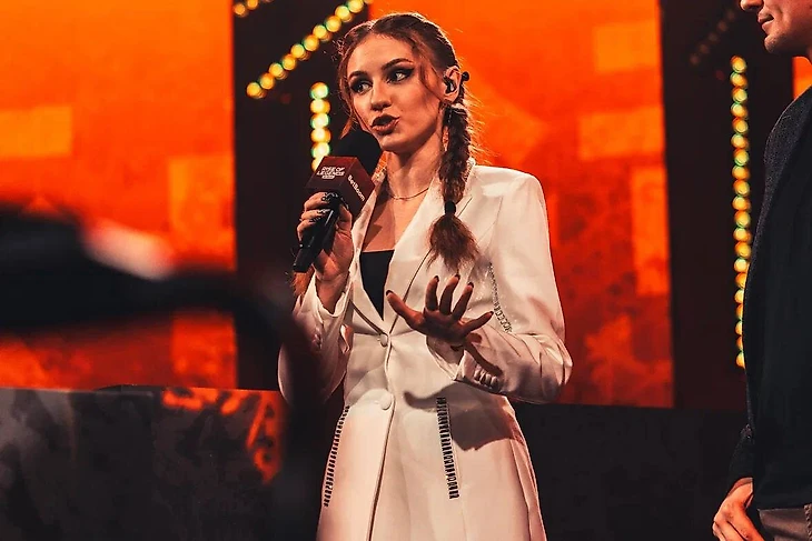 Еще одно приятное впечатление для дотера – вокруг полно знакомых лиц. Например, Василиса. Она уже давно время от времени врывается в MLBB и показывает молодой индустрии самый топовый уровень. Поэтому чаще всего она оказывается ведущей на сцене – и всегда сверкает.