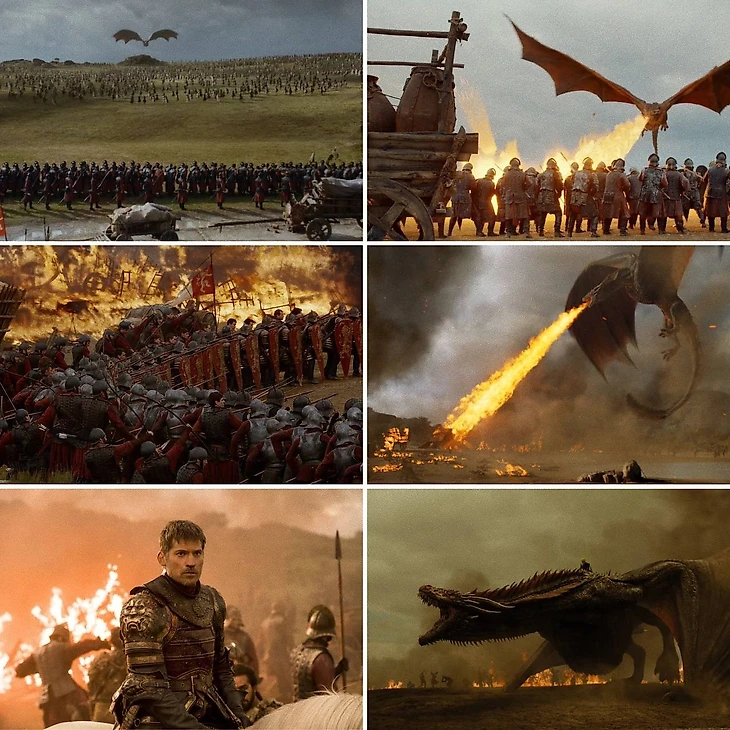 Дейнерис Таргариен летит на Дрогоне и командует «Дракарис», после чего Дрогон низвергает пламя на солдат Ланнистеров, сжигая их заживо. Тем временем дотракийцы пробивают фалангу и атакуют врагов. В ходе побоища дракон Дейнерис сжигает тысячи солдат и уничтожает повозки с припасами.