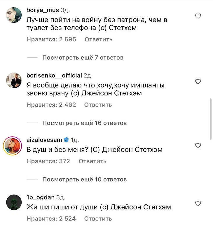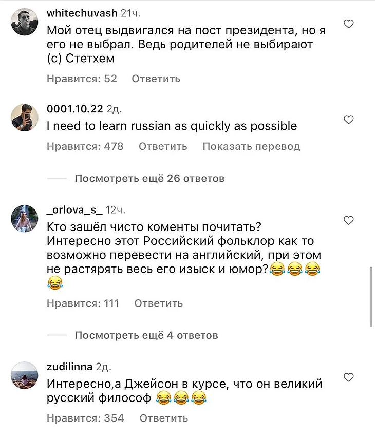 Ирония фанатов вышла на новый уровень. Они атакуют комменты в инсте актера: пишут туда лучшие панчи и собирают сотни лайков. При этом англоязычная аудитория даже с автопереводом не всегда понимает, что происходит – некоторые уже говорят, что собираются учить русский язык. Итак, погнали!