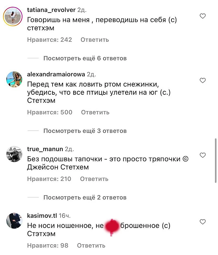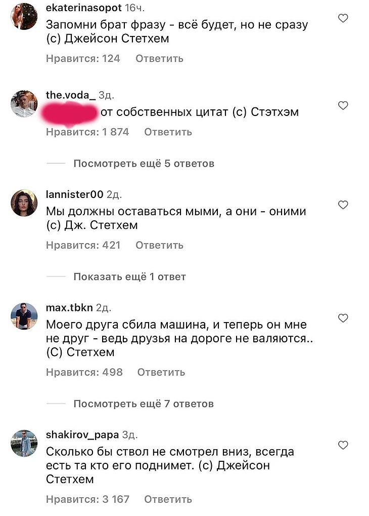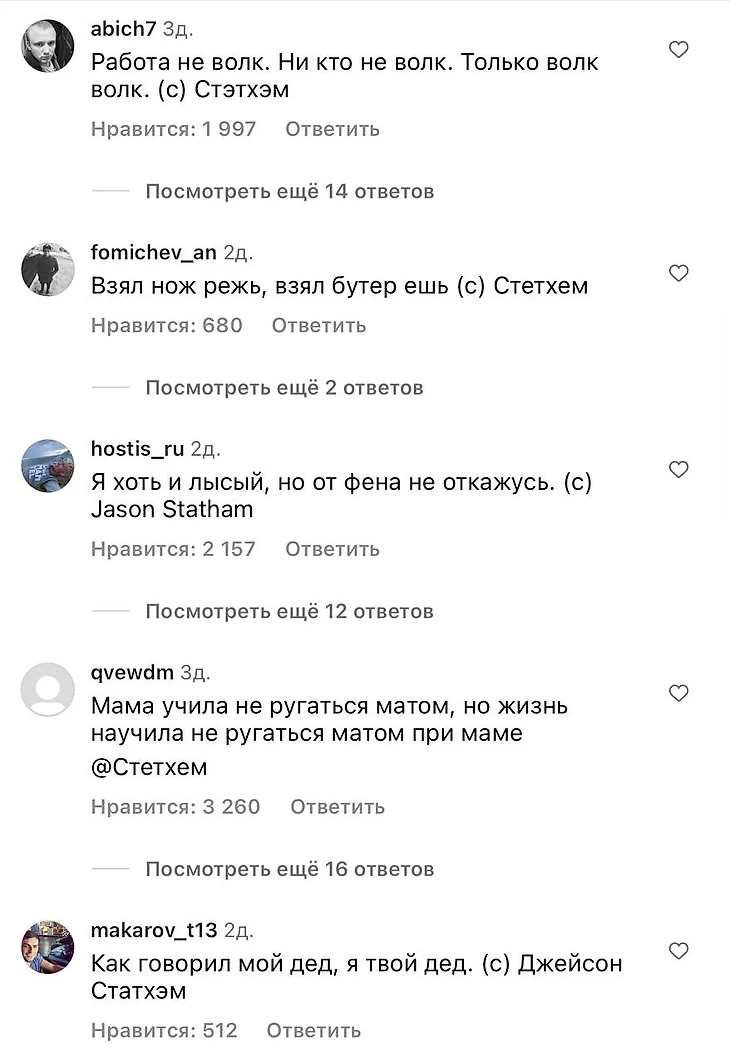 Например: «Многие жалуются на свою внешность, но на мозги не жалуется никто» или «Есть такая штука, как “Двигаться дальше”. Попробуйте, поможет». Эту тему стали развивать разные сайты и группы русскоязычных фанатов. Дошло до того, что в 2014 году в VK появился паблик с фейковыми «пацанскими» цитатами Стэйтема. А дальше – пошло-поехало.