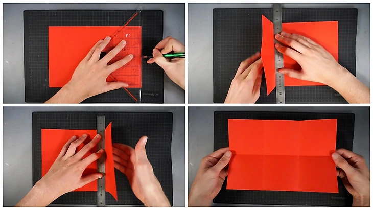 Перенесите на прямоугольники сетку сгибов как на фото ниже. Для этого с помощью линейки и карандаша сделайте метки, чтобы получить 6 квадратов: два ряда по три квадрата в каждом.