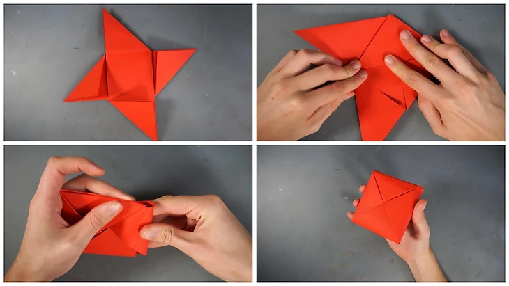 Положите два параллелограмма крест-накрест друг на друга. Затем по очереди сложите кончики внутрь, чтобы получился компактный конверт.