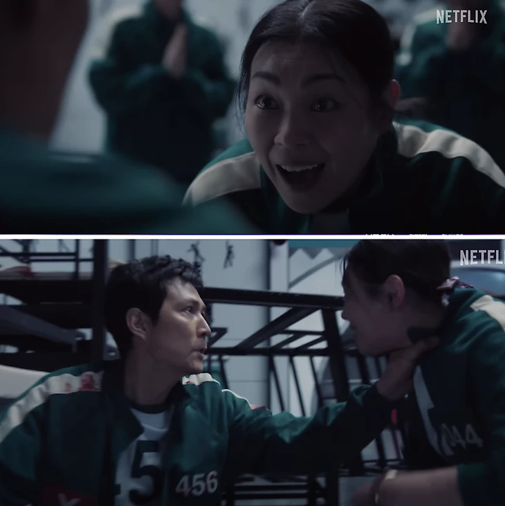 Когда главного героя приковали к кровати, подходит женщина-шаман и насмехается над ним. Игрок 456 хватает ее за горло! Это положит начало их открытой вражде.