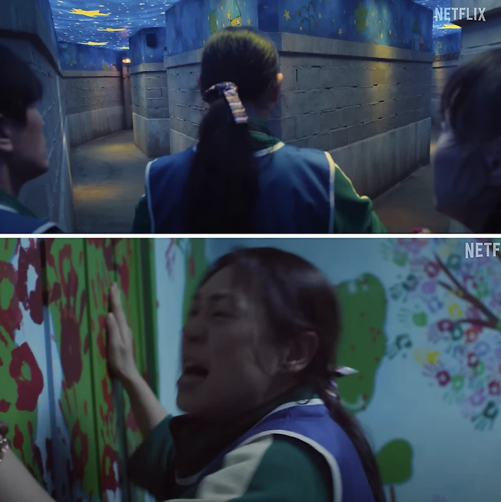 Сон Не (игрок 044) обращается к высшим силам, чтобы те помогли ей выбрать правильное направление в лабиринте. В другом кадре она разъяренно бьет в закрытую дверь – похоже, духи не помогли.
