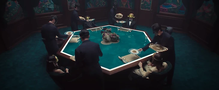 ● Стол с едой для пяти VIP-персон в масках. На них в трейлере сделан особый акцент – вероятно, личности богатеев будут раскрыты в финальном сезоне.