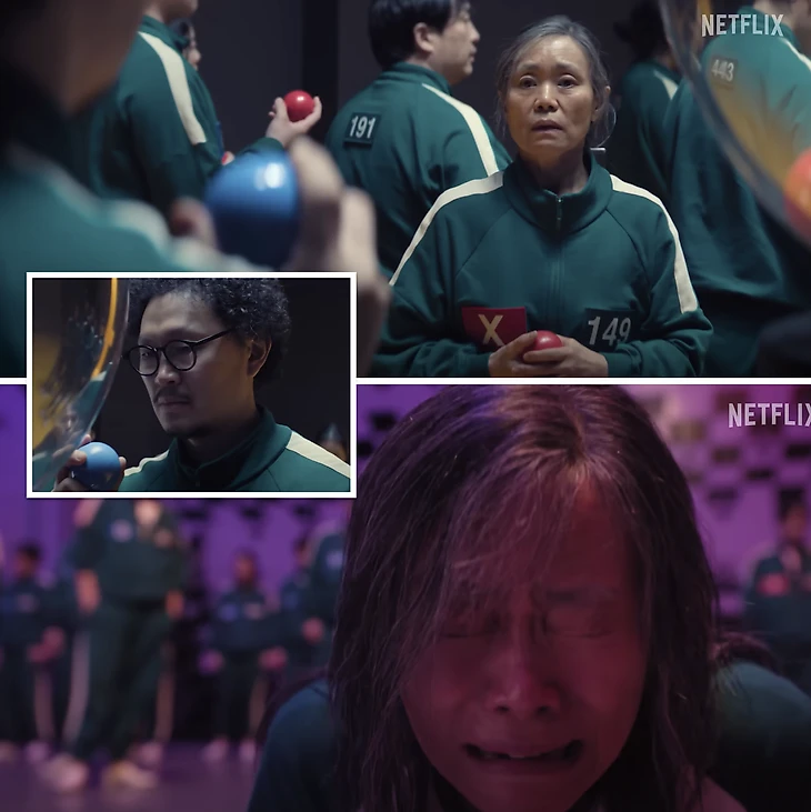 По выражению лиц понятно, что в разных командах оказались мама и сын: Чан Гумджа (игрок 149) и Пак Енсик (игрок 007). Позже показали кадр, где мать рыдает – тревожный знак для фанатов семейного дуэта. Также она произносит: «Я умоляю тебя завершить это сейчас».