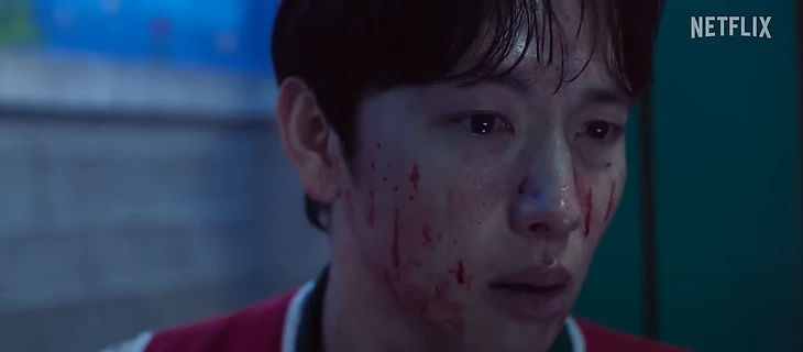 ● Оператор показывает растерянное и кровавое лицо Ли Менги (игрок 333), бывшего парня Ким Чонхи (игрок 222). Скорее всего, он убил кого-то значимого – например, Енсика.