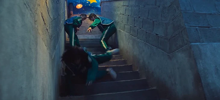 В пятом испытании «Игра в небесного кальмара» участники должны пройти три раунда: на каждой из трех огромных башен сбросить в пропасть минимум одного человека. Кихун предусмотрительно привязал ребенка к себе.