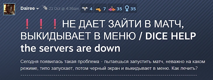 21 октября россияне массово испытали проблемы с доступом к серверам Battlefield 6, Dead by Daylight и другим играм. На форуме Steam сразу же появилась тема «Не дает зайти в матч», которая набрала более 1700 комментариев.