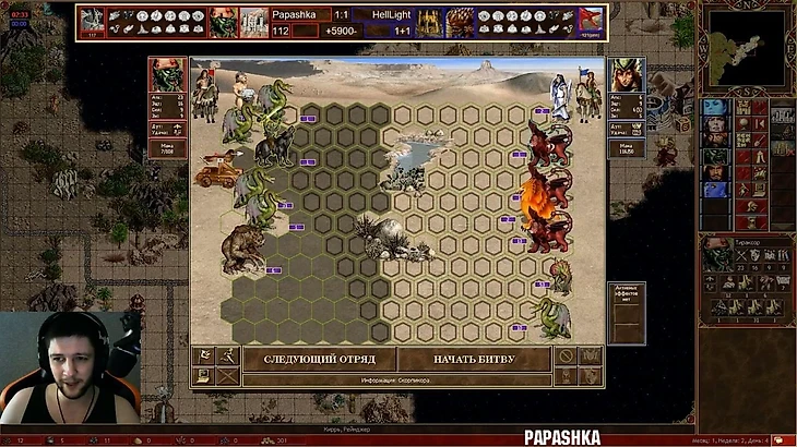 С экспертной Тактикой Papashka расставил войска для защиты своих циклопов вместо максимального продвижения вперед Чудищ и Виверн: ошибка, сильно усложнившая ему бой. Тем не менее Киррь даже не имела в своем распоряжении Замедление, поэтому надежда была только Слепоту и паралич от улучшенных Котов.