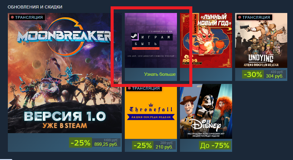 Найти страницу фестиваля можно на странице распродажи, на которую можно попасть с главной страницы Steam. Нажмите на баннер в разделе «ОБНОВЛЕНИЯ И СКИДКИ» в самом низу страницы.
