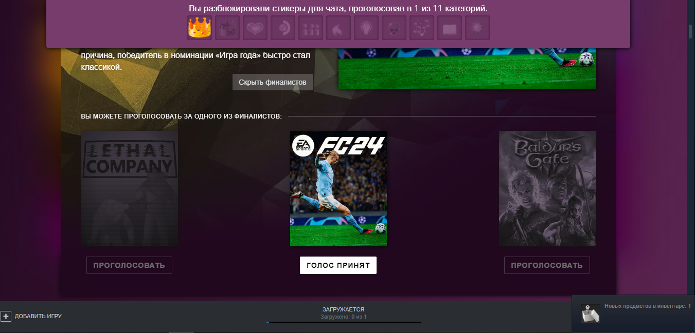 За каждый голос вы будете получать случайный стикер из набора The Steam Awards 2023: