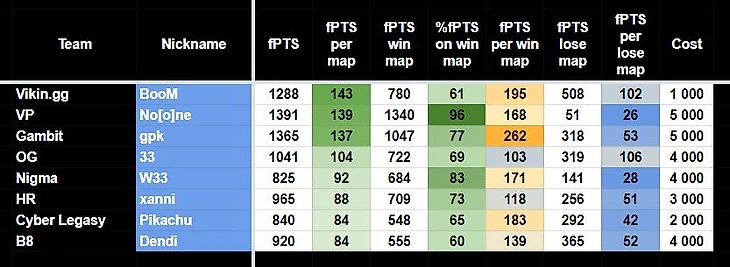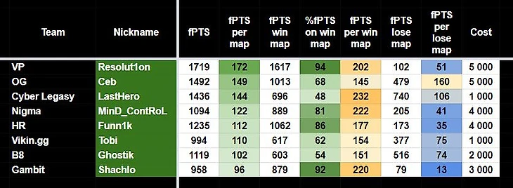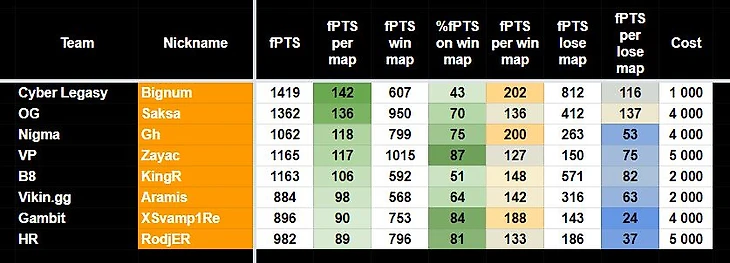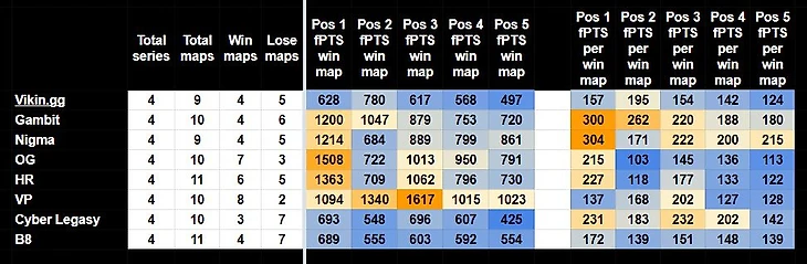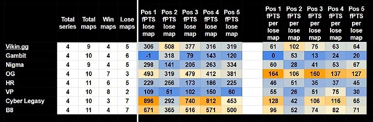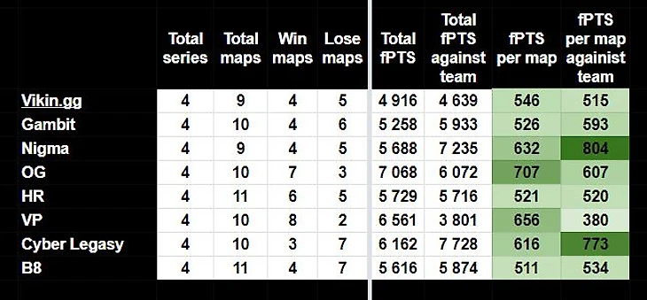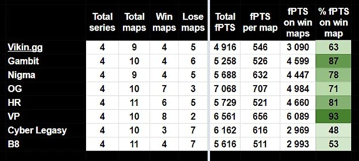Gambit и Nigma на проигранных картах набирают очень мало, а львиную долю ФО получают на выигранных. У OG и VP процент побед примерно равен проценту ФО, набранных на победных картах. Cyber Legacy набирает примерно одинаково, только вот побед у них гораздо меньше, чем поражений, поэтому удельный набор ФО с победной карты у них высок. Аналогичная ситуация и у HR – всего 19% ФО приходится на 5 проигранных карт. Основной набор происходит на выигранных картах. Про Vikin.gg и B8 сложно что-то утверждать.