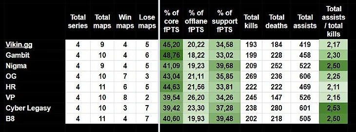 Таблица дает лишь общее представление о распределении ФО по ролям, но прослеживается некоторая корреляция с удельным количеством ассистов на 1 убийство. У Nigma, Cyber Legasy и B8 коры и саппорты набирают практически одинаковое количество ФО. У этих же команд самый высокий показатель удельного количества ассистов на 1 убийство. То есть в убийствах принимает участие в среднем большее количество человек. У VP выделяется 26% ФО оффлейнера, а вот у Vikin.gg, HR, OG и, особенно, Gambit процент набора ФО корами существенно выше ФО саппортов, что обусловлено, скорее всего, частыми соло убийствами и косвенно подтверждается меньшим показателем удельного количества ассистов на 1 убийство.