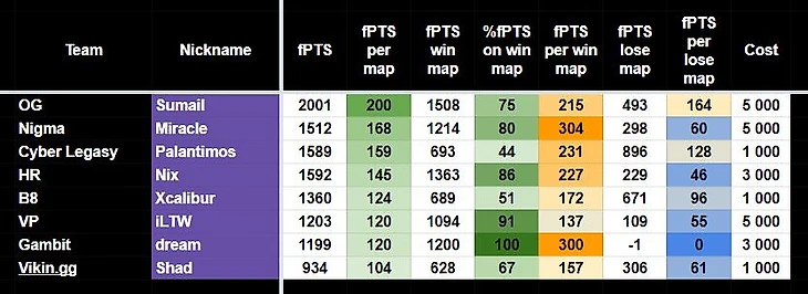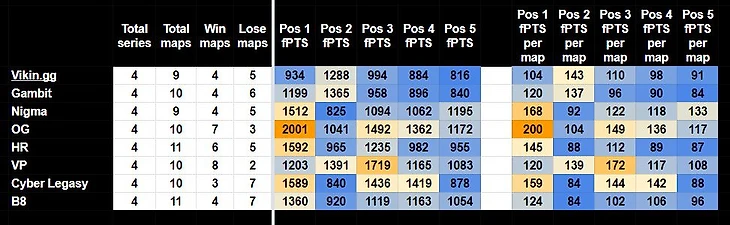 OG играют по принципу «вы забьете сколько сможете, а мы сколько захотим», поэтому набирают ФО сами и дают набирать другим. А вот 804 ФО, набранные против Nigma, не должны вводить в заблуждение. Как только эта команда перестанет заниматься ерундой, показатель пойдет вниз. В отличии от Cyber Legacy, игры которых отличаются большим набором ФО с обеих сторон. А вот VP, по ощущениям, играют без особых перепадов, поэтому 380 ФО, набираемые в среднем против них, говорят о том, что игрок из очередного соперника VP – не лучший выбор для вас.