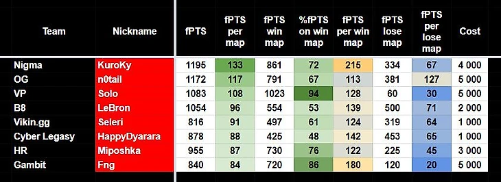 В победных картах Nigma и Gambit на высоте, особенно керри. А Gpk лучший мидер, если его команда побеждает.