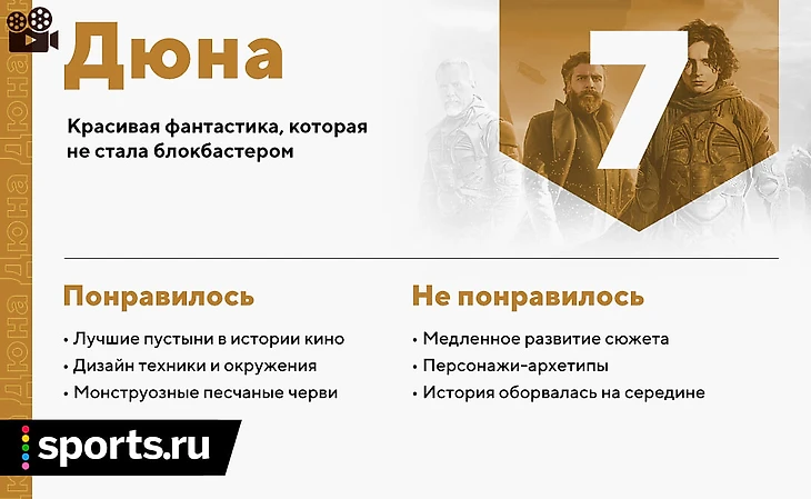Бессмысленно давать «Дюне» какую-то формальную оценку. Несмотря на грандиозный размах, у нее вряд ли получится стать главным блокбастером года и тем более важным культурным явлением, какими стали «Звездные войны» и трилогия «Властелин колец». Есть отличный способ проверить, ваше ли это кино: посмотрите еще раз трейлер и представьте, что то же самое вам показывают 2,5 часа. Если вам в кайф – идите и не пожалеете (я не пожалел), а на приключения и драки лучше посмотрите через две недели в новом «Бонде».