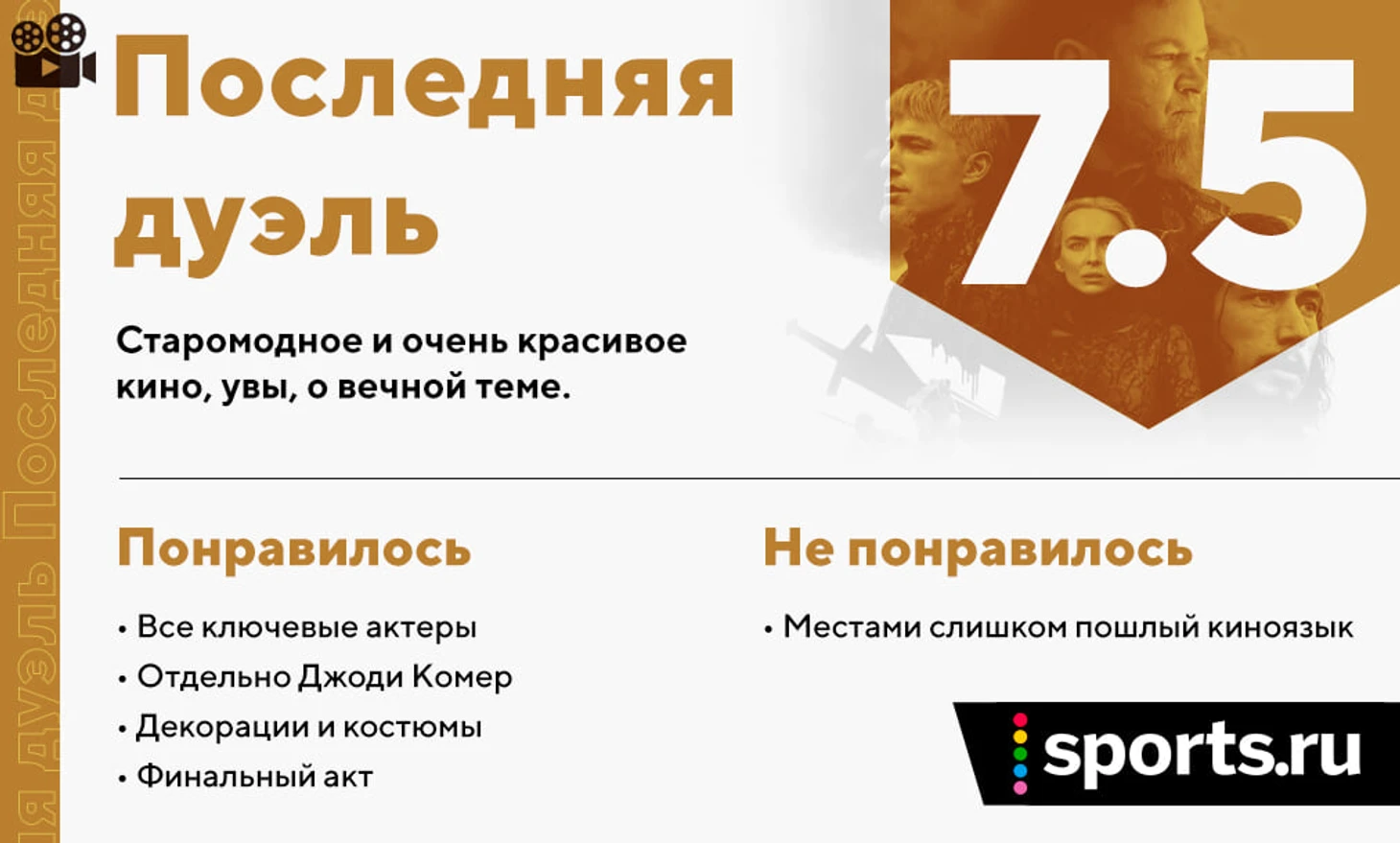 Сходить на «Последнюю дуэль» в кино все-таки стоит – как минимум потому, что это почти наверняка один из последних фильмов такого рода. Учитывая сегодняшние тенденции, подобные сложные исторические драмы, заставляющие думать и дискутировать о неудобных темах, в будущем будут либо гораздо более бюджетными, либо выходить сразу на стримингах. И даже Ридли Скотту уже вряд ли позволят снять что-то подобное – мало кому нравится терять десятки миллионов долларов ради «умного кино».