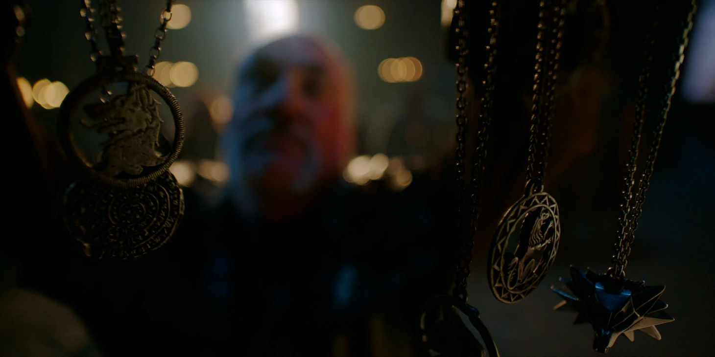 В сериале Геральт носит медальон круглой формы с волчьей головой, у остальных ведьмаков тоже подобные круглые медальоны с головой волка, но разными узорами.