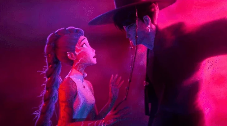 Любовная линия между Руми и Джину в мультфильме «Кейпоперши-охотницы на демонов» развивается постепенно, придавая сюжету глубину и эмоциональную насыщенность. Постепенно раскрывается история Джину, демонстрирующая его внутреннюю борьбу между человеческой и демонической сущностью – тема, резонирующая с личным конфликтом Руми. Обоюдное сопротивление двойственной природе сближает героев, делает отношения более сложными и многогранными. Через призму взаимодействия зрители узнают ключевые детали о влиянии короля демонов Гви-Ма, который способен проникать в сознание людей, заставляя их служить ему, что придает истории дополнительный драматизм.