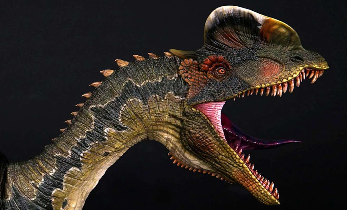 Дилофозавр был крупным хищником раннего юрского периода, достигавшим 7 метров в длину и веса около 400 кг. Он отличался высокой подвижностью и длинными задними конечностями. Главная особенность – пара округлых гребней на черепе, вероятно, использовавшихся для демонстрации. Череп имел характерный излом, а зубы были коническими и зазубренными, особенно спереди. Передние лапы имели четыре пальца, один из которых – рудиментарный. На экране он появляется в первом фильме «Парк Юрского периода» (1993): прячется за поваленной машиной Денри и использует вымышленную способность – разбрызгивает яд в лицо, раскрывает костистый воротник – чтобы убить Недри.