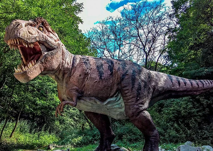 Мощный хищник мелового периода, достигавший 15 метров в длину и 6 тонн в весе. Обладал мощной челюстью и сильной шеей, способной разрывать крупную добычу. Передвигался со скоростью до 40 км/ч, используя хвост для балансировки. Хотя Ти-рекса считают опасным охотником, некоторые теории говорят, что он был скорее падальщиком. Его короткие передние лапы стали поводом для множества шуток. В фильмах «Парка юрского периода» он то спасает героев, то становится угрозой для их жизни.
