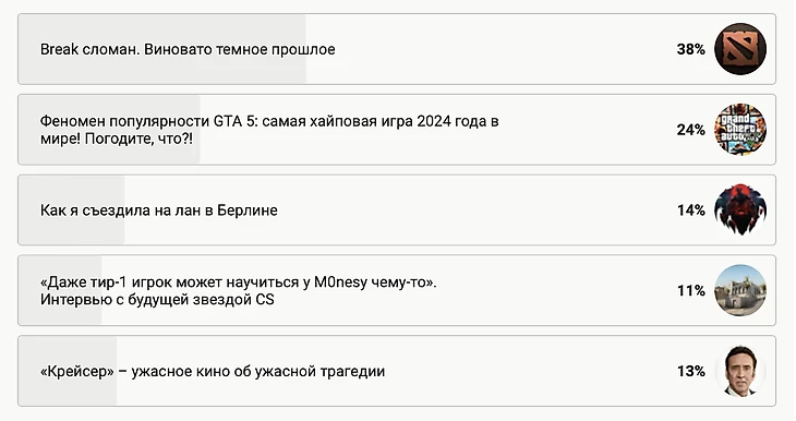 Второе место у текста «Феномен популярности GTA 5: самая хайповая игра 2024 года в мире! Погодите, что?!» – 24% голосов. Автор блога «Ты что, кибер?» получает 2000 рублей на кошелек Steam.