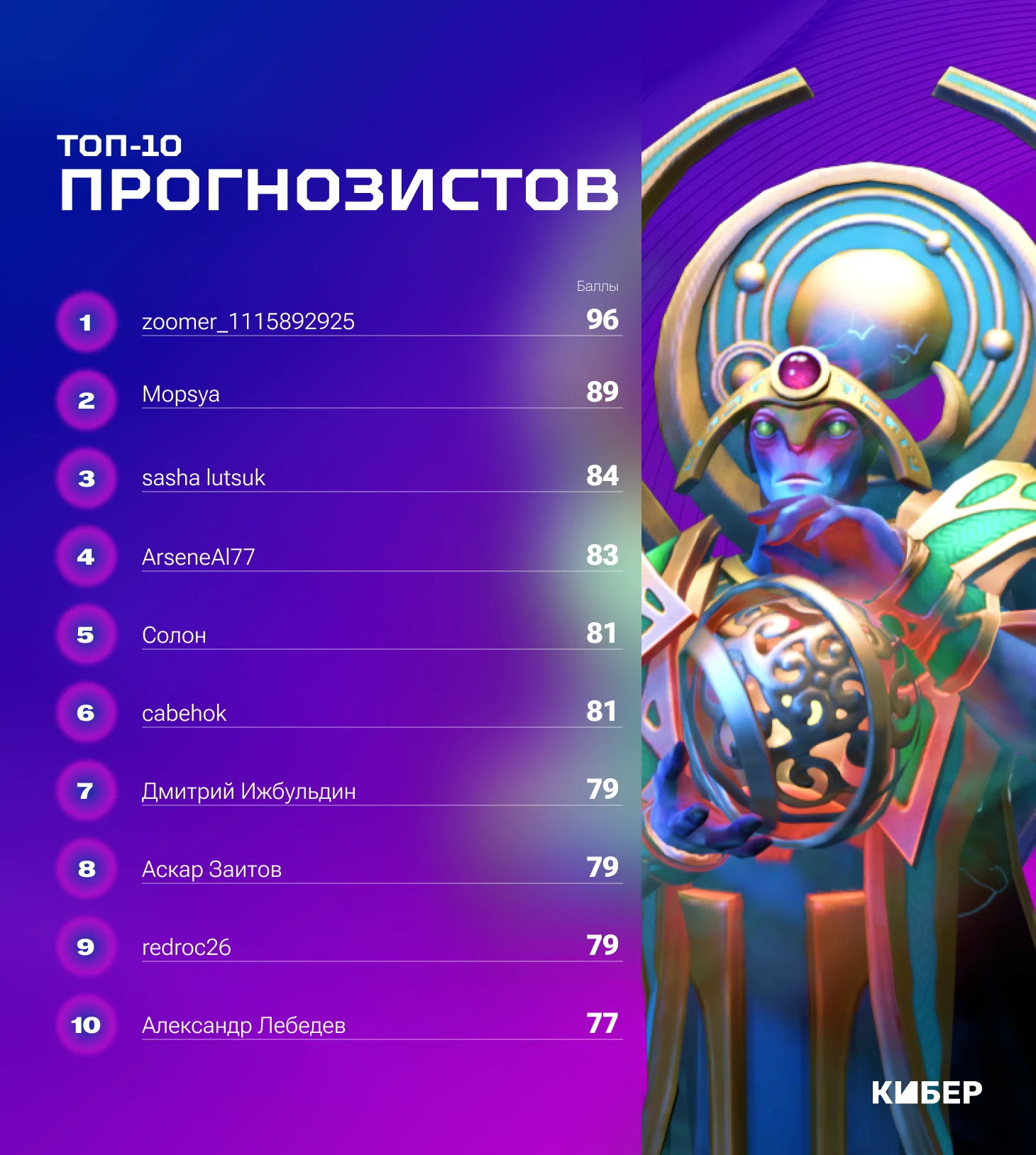 При равенстве очков у двух или более участников выше в рейтинге будет тот, кто угадал больше точных результатов. При равенстве этого показателя выше окажется тот, кто угадает больше исходов в матчах формата bo3 или bo2. При равенстве всех показателей выше будет участник, который оставил прогноз в первый день раньше конкурентов.