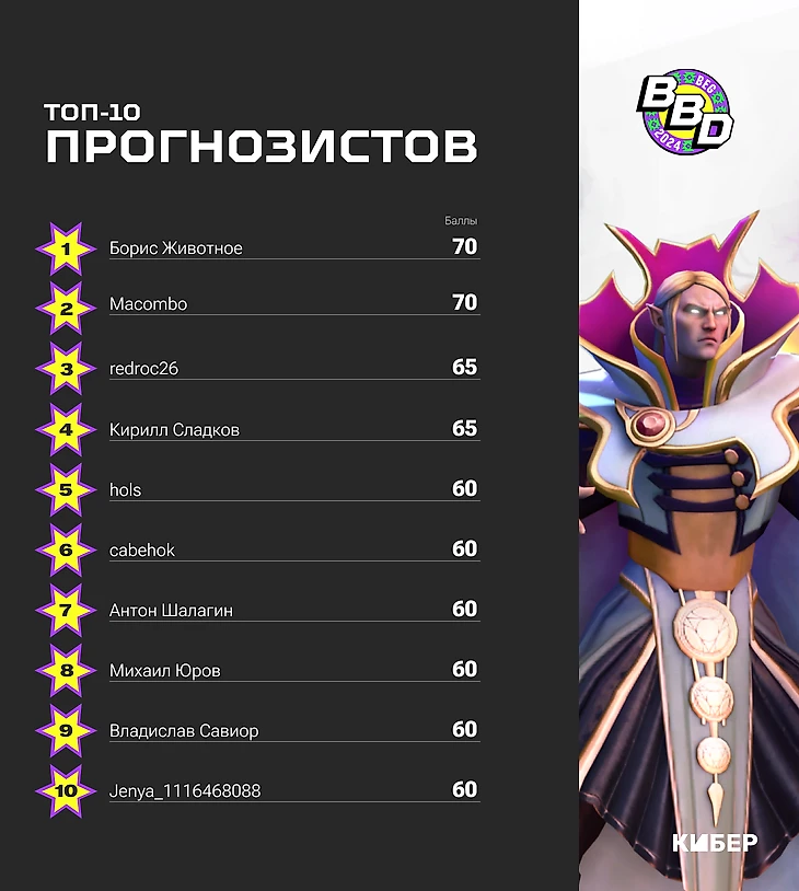 19 октября стартовала BetBoom Dacha Dota 2 2024. К турниру Кибер снова запускает конкурс прогнозов: пишите в комментариях предикты на матчи турнира, зарабатывайте баллы за верные прогнозы и выигрывайте призы.