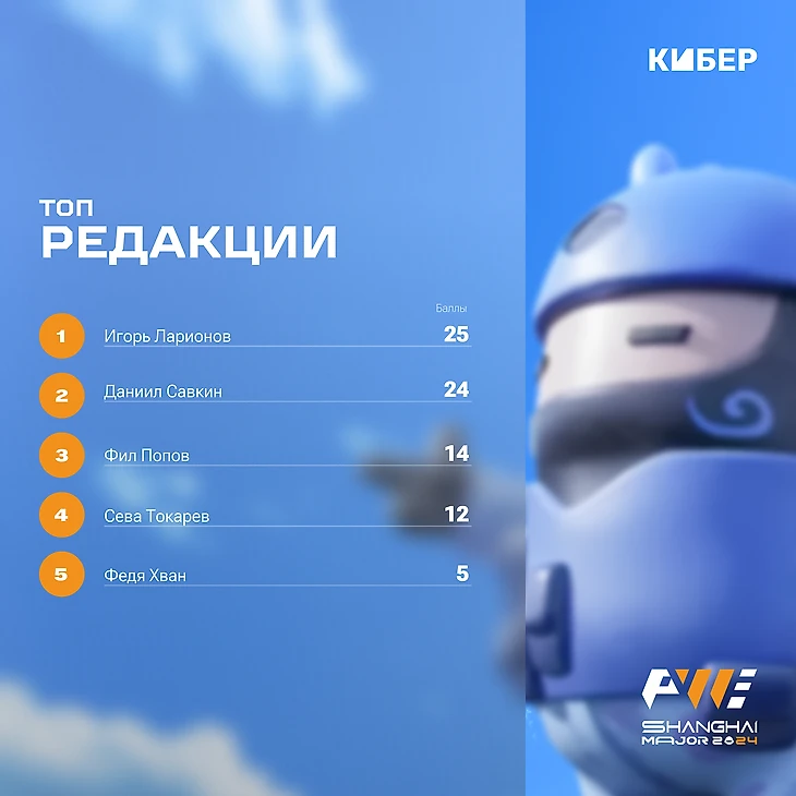 В этот раз вне зачета конкурса – CS-раздел Кибера, у которого собственная таблица. К тому же редакция будет делать прогнозы в комментариях и иногда делиться аналитикой по турниру и играм.