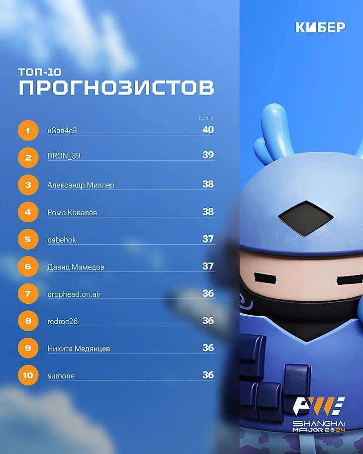 Привет! 30 ноября стартовал Perfect World Shanghai Major 2024. К турниру Кибер снова запускает конкурс прогнозов! Пишите в комментариях предикты на матчи, зарабатывайте баллы и выигрывайте призы.