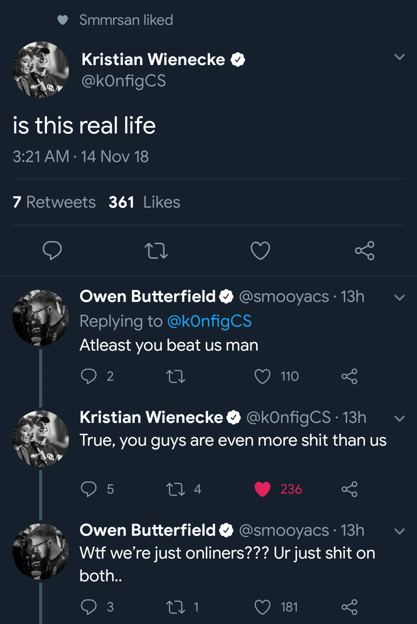Сегодня же smooya и k0nfig устроили перепалку в твиттере после поражения Optic Gaming от Epsilon в четвертьфинале ESEA MSL Season 29.