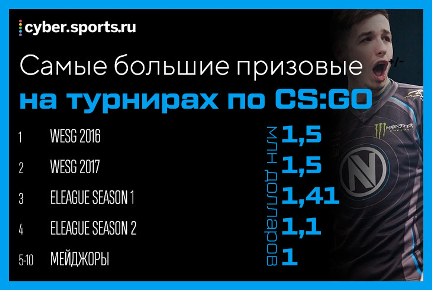 Но даже мейджоры – не самые ценные турниры в CS:GO. Больше всех за последние два года получали победители WESG (Team Envyus в 2016 и Fnatic в 2017). Также внушительный призовой фонд предоставляет ELEAGUE: она вполне способна раздать более миллиона долларов и без поддержки Valve.