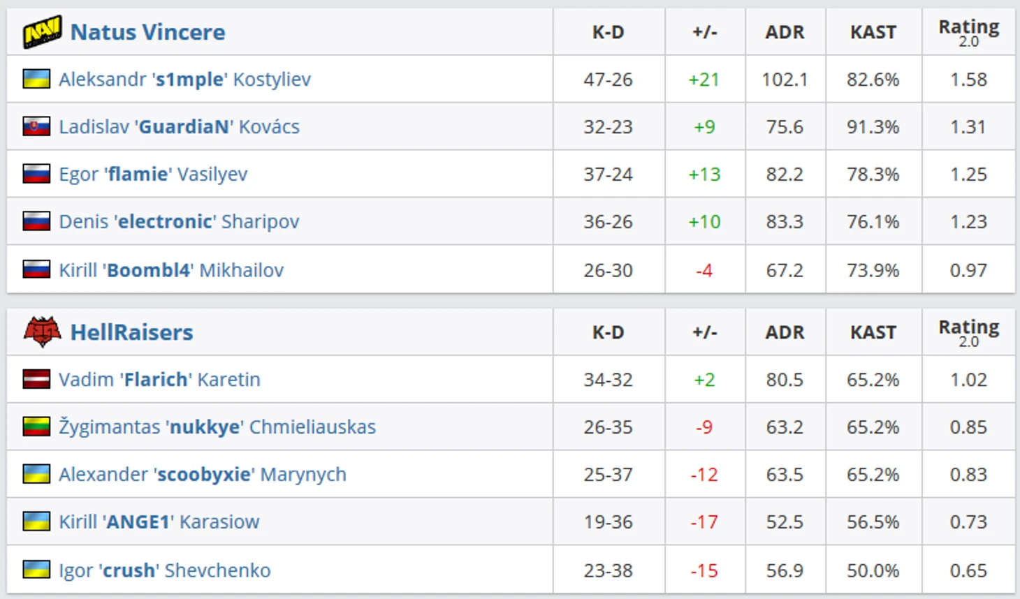 NaVi без проблем разобрались с Hellraisers в своем первом матче на ESL Pro League Season 10. Обе карты закончились со счетом 16:7, а главной звездой матча стал S1mple. За 46 раундов он набил 47 фрагов и закончил игру со средним рейтингом 1,58 – очень крутой показатель.