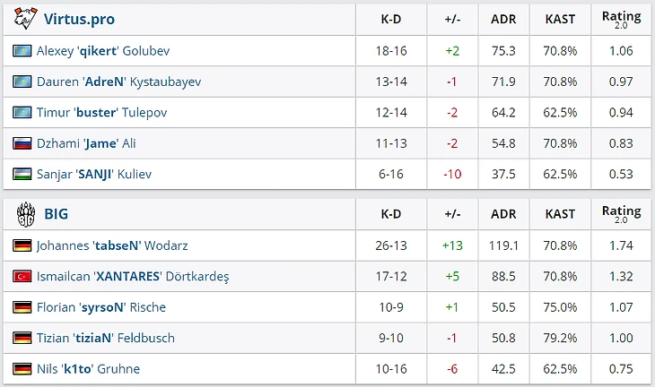 К сожалению, это все, за что можно сегодня похвалить Virtus.pro. Игра была полностью под контролем BIG, и немцы с легкостью забрали ее со счетом 16:8. Благодаря отличной стрельбе от Табсена и Кзантареса, которые настреляли 43 фрага на двоих, BIG легко выходила даже из сложных ситуаций 3 в 5.