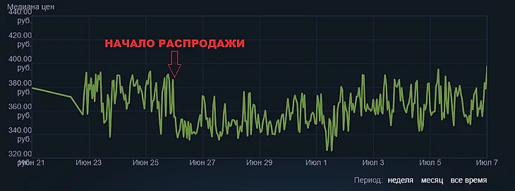 Из-за этого во время каждой крупной распродажи в Стиме скины немного уменьшаются в цене, так как предложение значительно превышает спрос. Многие эксперты по скинам советуют закупаться оружием как раз во время скидок на игры, потому что в это время можно урвать желаемую пушку немного подешевле.