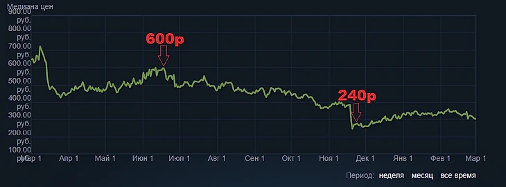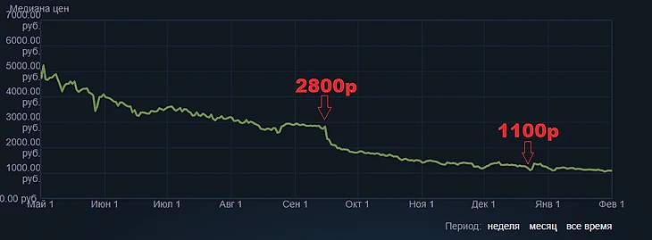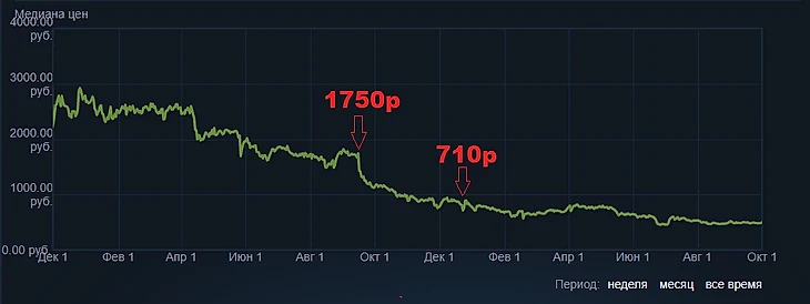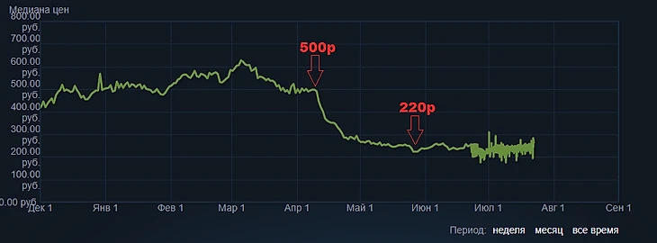 Вот так выглядел график цен на AK-47 Колымага. Стоимость оружия упала примерно со 390 до 330 рублей. Немного, но достаточно, чтобы изменить весь рынок Steam. Подобное падение цен произошло со всеми популярными скинами.