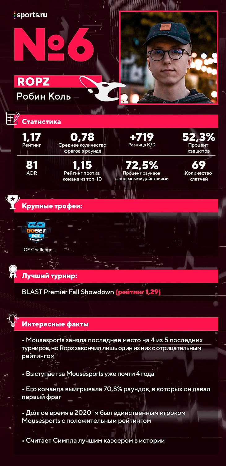 За несколько лет в Mousesports Ropz уже стал легендой организации. Робину все еще 21, и его прогресс в некоторых аспектах за 2020 год доказывает, что эстонец еще очень далек от своего пика. Возможно, в следующие несколько сезонов Ropz поборется не только за звание самого стабильного игрока в мире, но и за титул лучшего из лучших.