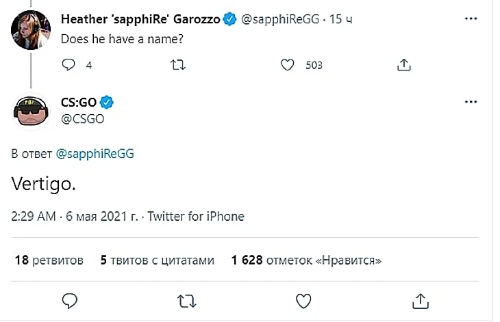 В сообществе сразу захотели узнать, как зовут пернатого. Об этом в твиттере спросила Sapphire, ранее выступавшая за женский состав Dignitas. Разработчики ответили, что петушка зовут так же, как и еще одну карту в маппуле – Vertigo