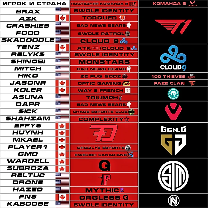 Саша Петрик подметил очень важную деталь - т2 Северной Америки действительно просела. В июле я делал примерный список тех, кто ушел из CS:GO в Valorant. У меня вышел примерно такой список, который все еще актуален за некоторыми изменениями.
